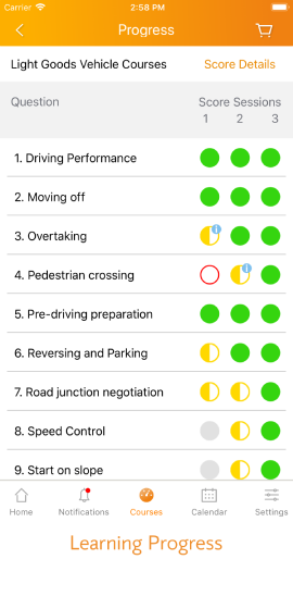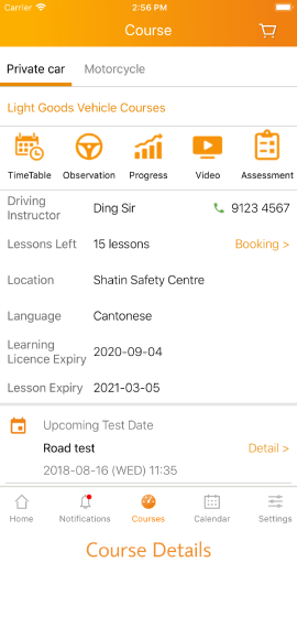 Students can access their course details and important information including test date, learner license expiry date…etc. They can also view their learning progress and watch training videos.